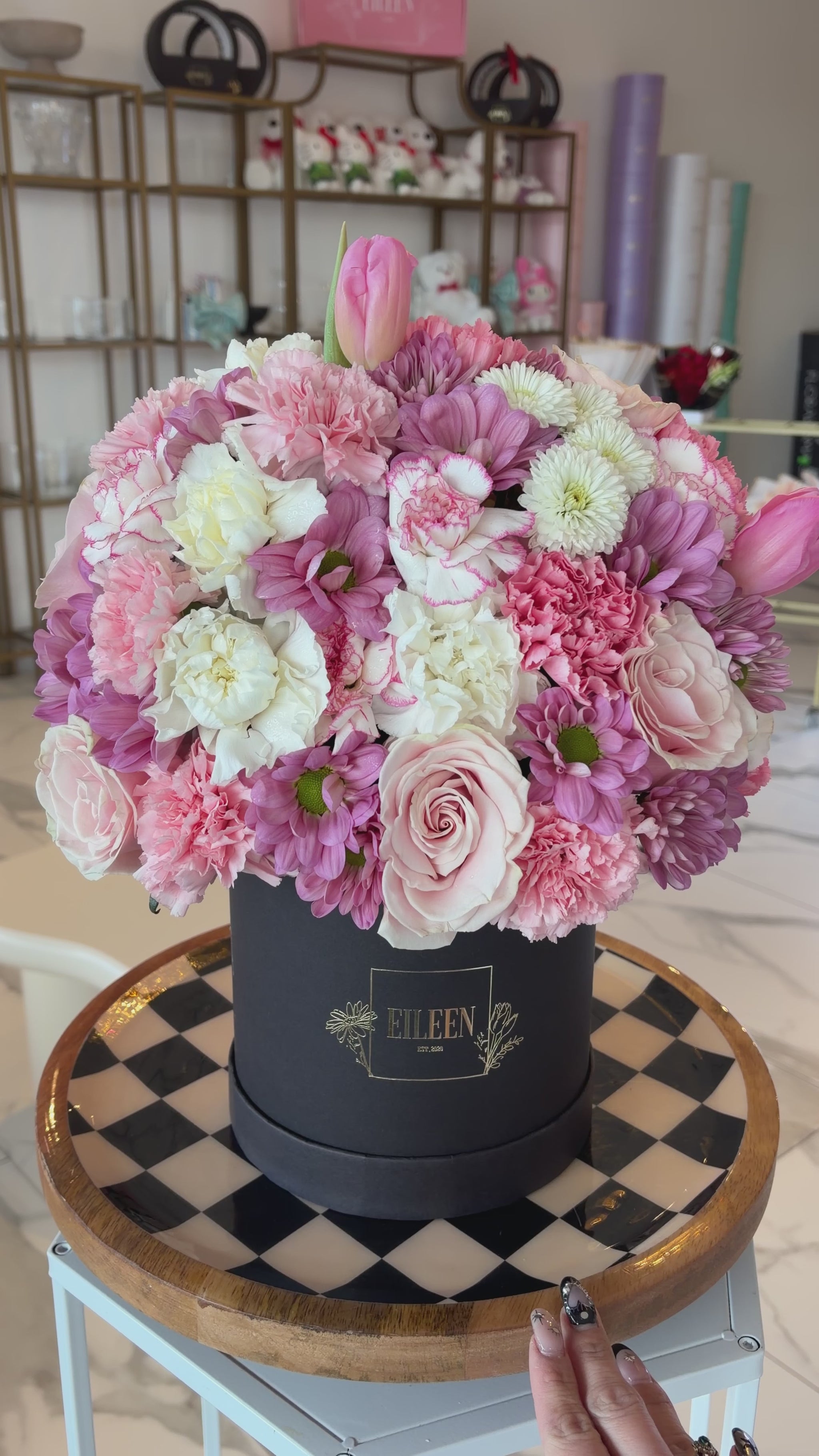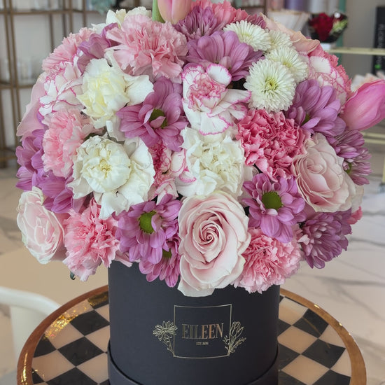 A delicate and feminine floral arrangement designed in a modern black hatbox, featuring a harmonious blend of blush pinks, soft mauves, and creamy whites. The bouquet showcases premium blooms including roses, tulips, carnations, chrysanthemums, and daisy mums, layered closely together for a full, cloud-like appearance.