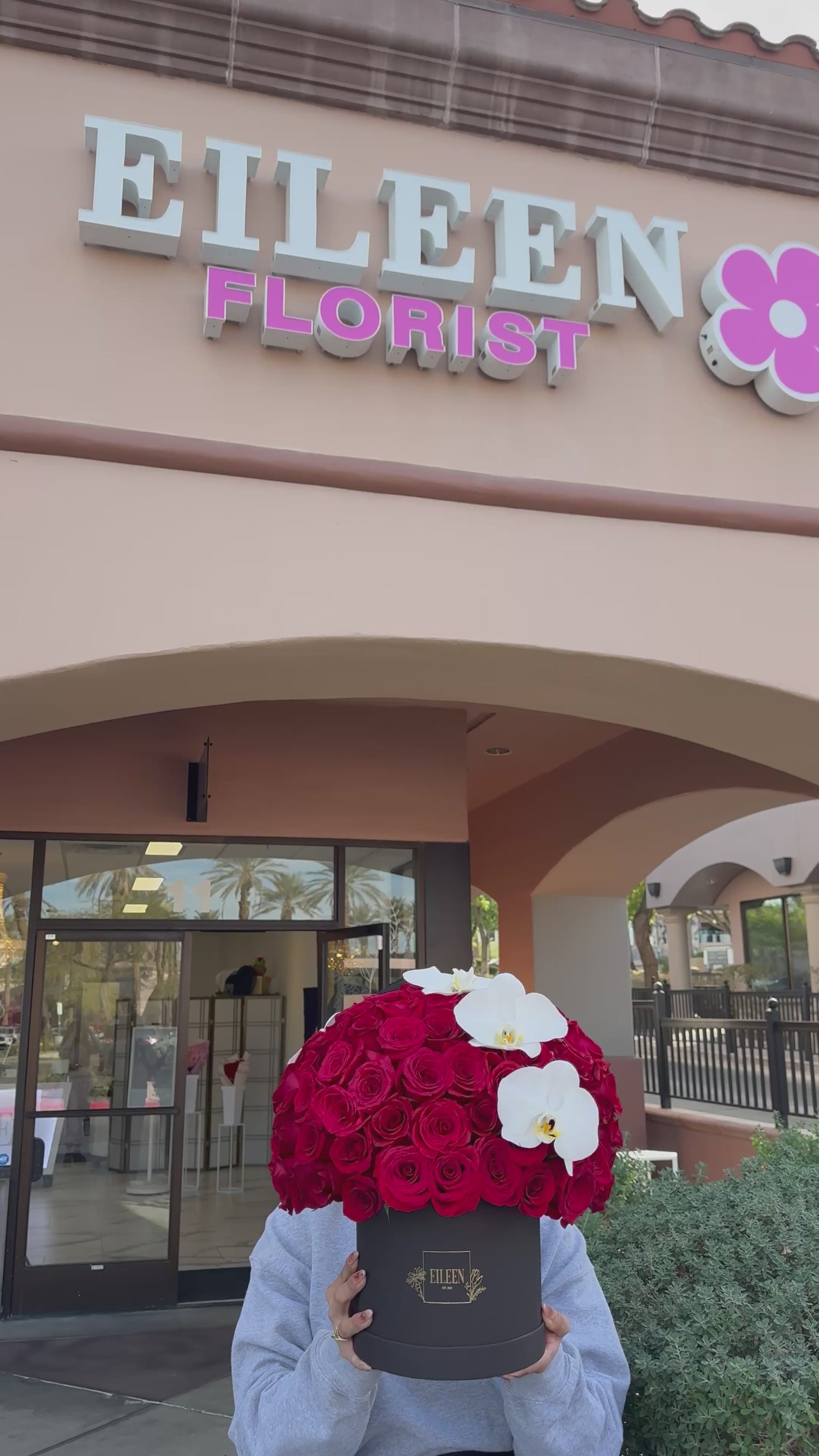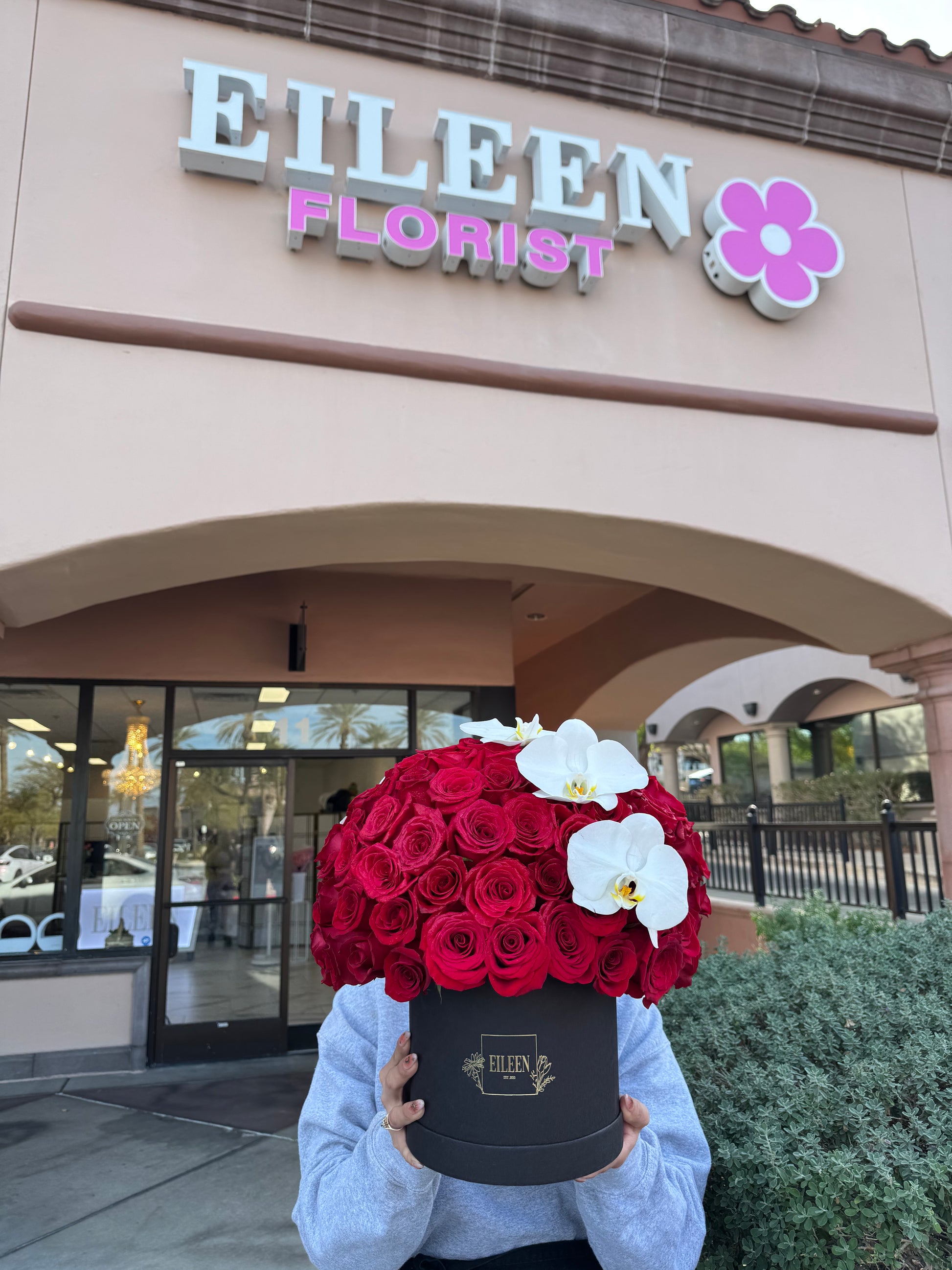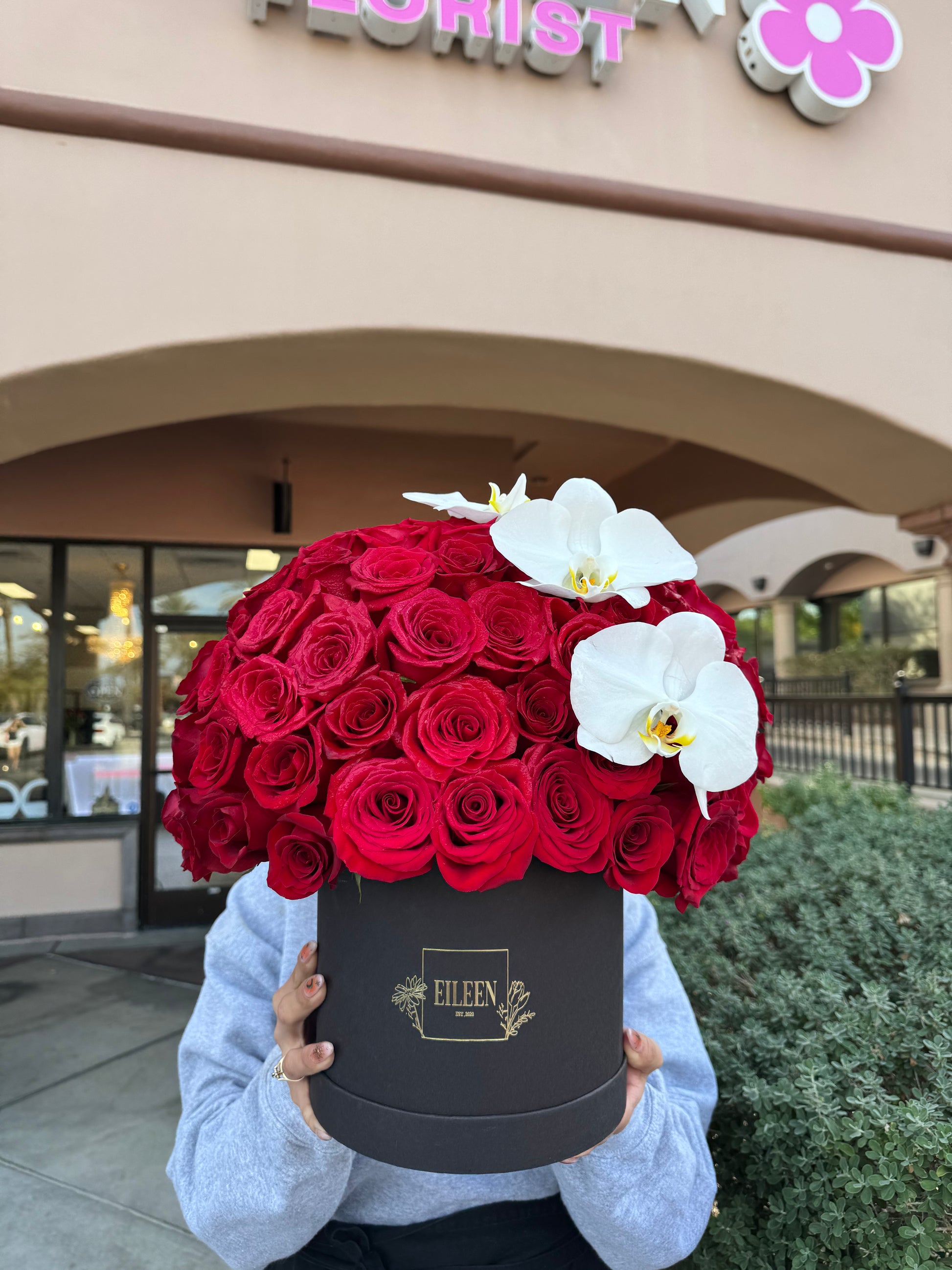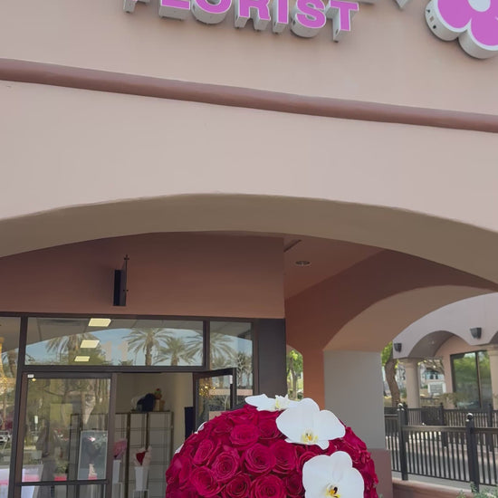 This stunning floral arrangement, housed in a sleek black box adorned with the name “EILEEN,” is the epitome of luxury and romance. A lush dome of velvety red roses is perfectly accented by cascading white orchids, creating a striking contrast that exudes sophistication. The seamless blend of deep crimson and soft ivory tones makes this arrangement an ideal statement piece for grand gestures, upscale events, or heartfelt expressions of love. Carefully crafted with a balance of modern elegance and timeless beauty, Eileen Elegance is a breathtaking floral masterpiece.