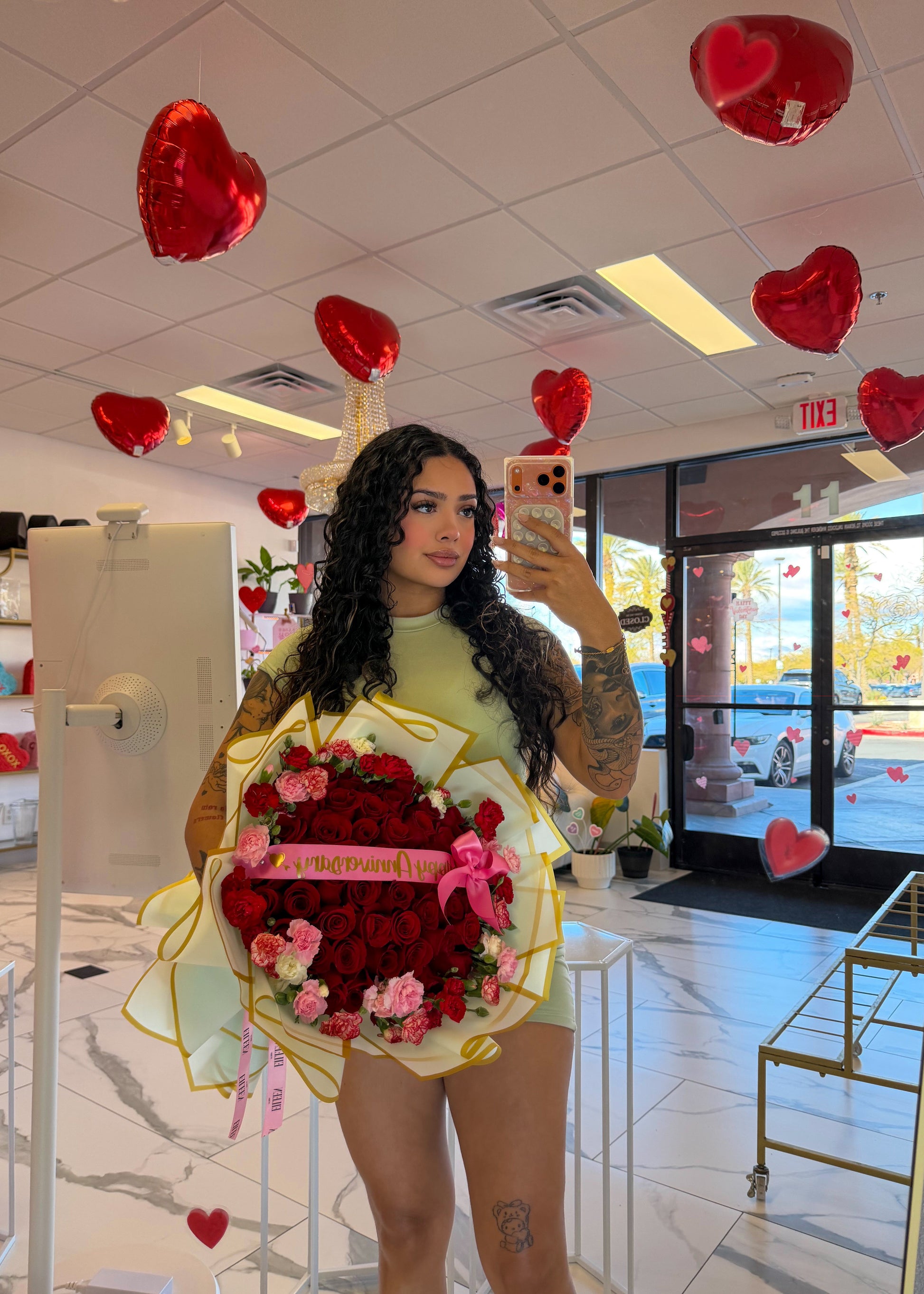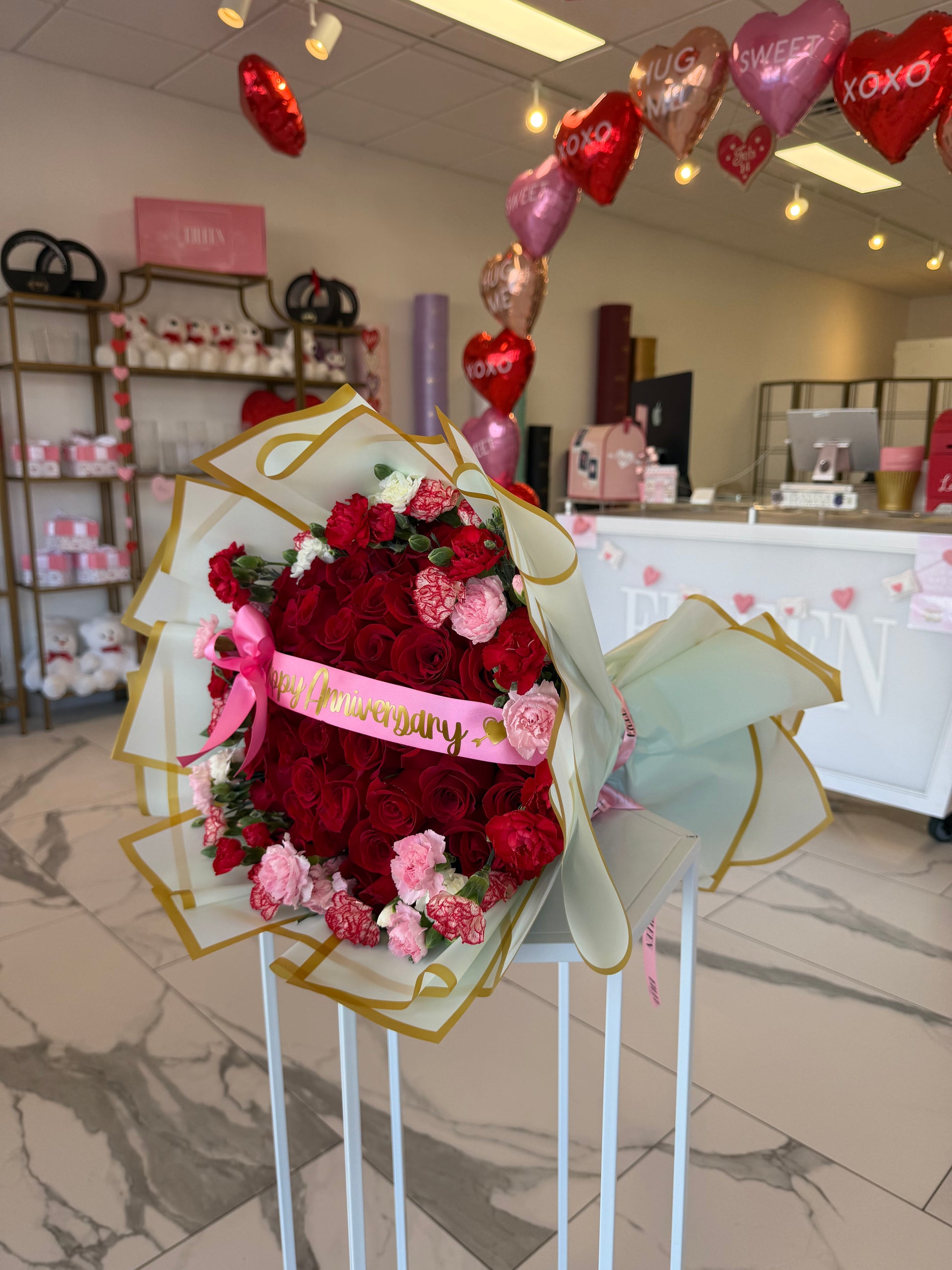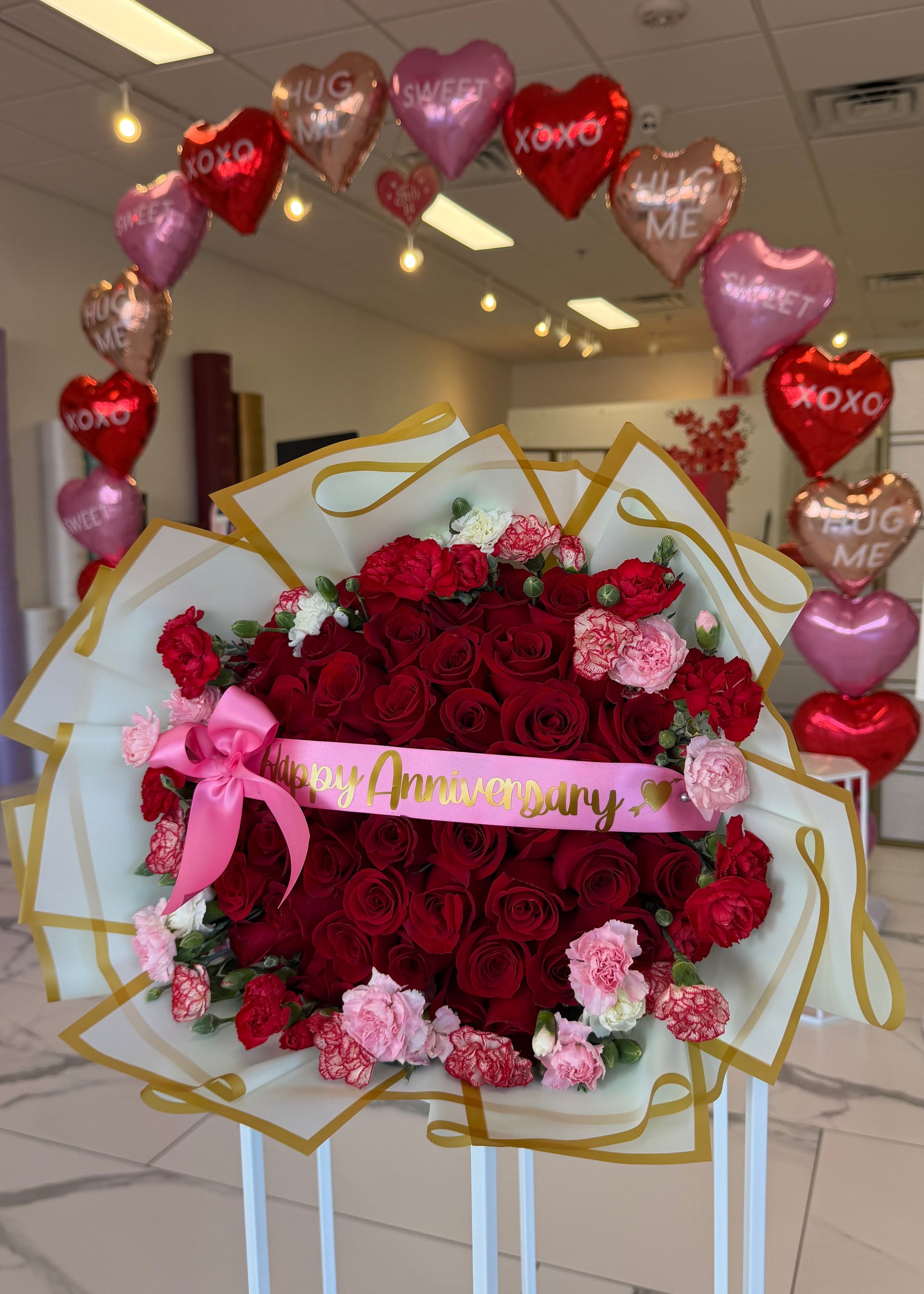 A stunning Valentine’s Day arrangement featuring 50 premium Ecuadorian red roses, prized for their large blooms and deep, velvety petals. Designed in a lush, round style and accented with soft pink and white carnations for a romantic touch. Wrapped in elegant white paper with gold detailing and finished with a pink satin ribbon that reads “Happy Valentine’s”, this arrangement is the perfect expression of love and